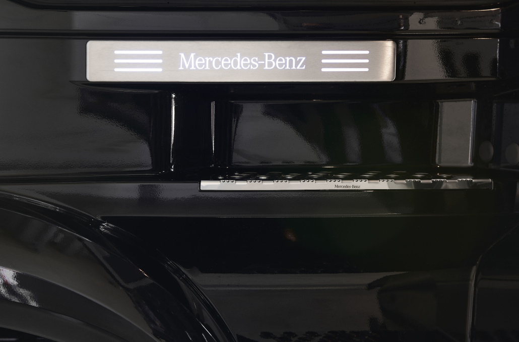 I døråpningen er det ett opplyst Mercedes-Benz skilt samt att trinnene er i rustfritt stål på både fører- og passasjersiden.