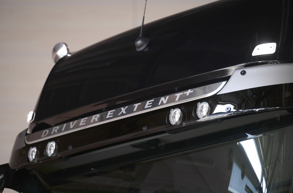 Fire runde, takmonterte LED hovedlys sørger for god sikt under alle forhold. For- og bakakselen er utstyrt med hjulbolthetter og bakakseldeksel. Disse leveres i sort lakk eller i rustfritt stål. På rammen De lukkede aluminiums rammedekslene har to ekstra trinnplater i tillegg til standardtrinnene.