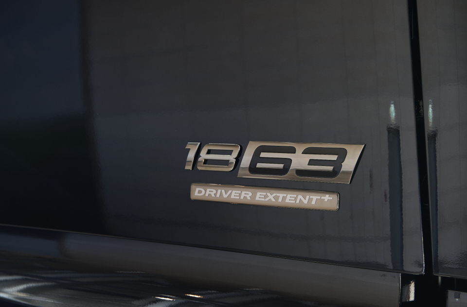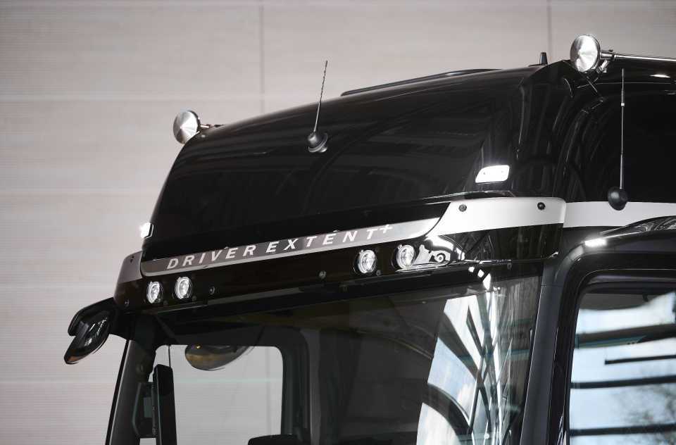 Navnet taler for seg selv i fronten finner man derfor en Actros logo i mørk krom. I tillegg står det Driver Extent+ i en chrome plate over frontruten. Dekalene er matt grå og førerhusfargen kan velges fritt.