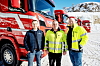 LEVERANSE: Roger Listul fra Scania (til venstre) sammen med bilansvarlig Halvor Haugan og Stian Johansen i Alf Johansen AS ved overleveringen av de fem nye V8-erne.