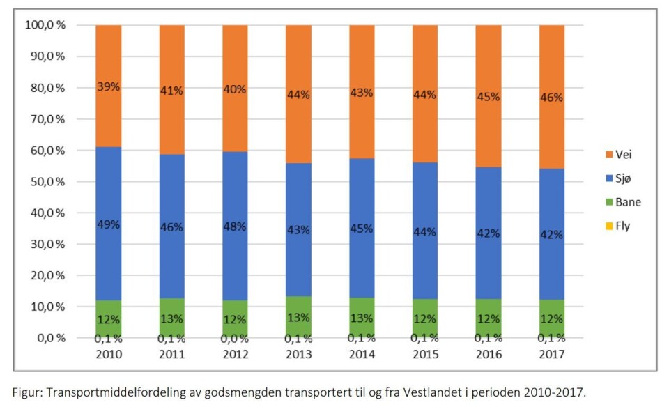 I 2017 ble 46 prosent av alt gods til og fra Vestlandet fraktet på veien, mot 39 prosent i 2010. Samtidig er sjøtransportens andel redusert med sju prosentpoeng fra 49 til 42. Jernbanens andel har vært stabil på 12 prosent i perioden.