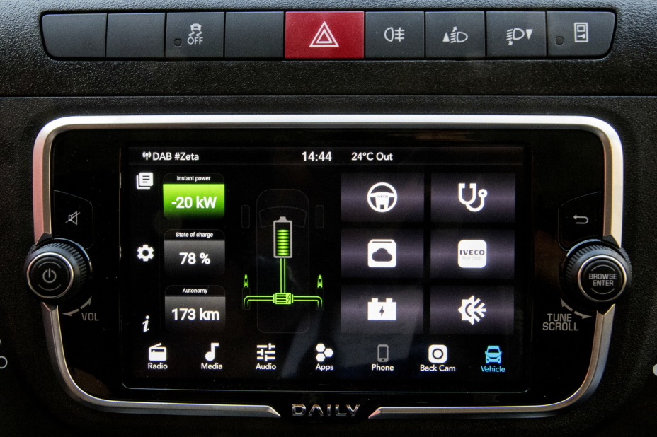Bilen kan lades med inntil 22 kW DC og 80 kW AC, noe som gir 100 km rekkevidde på 30 minutter, ifølge Iveco.