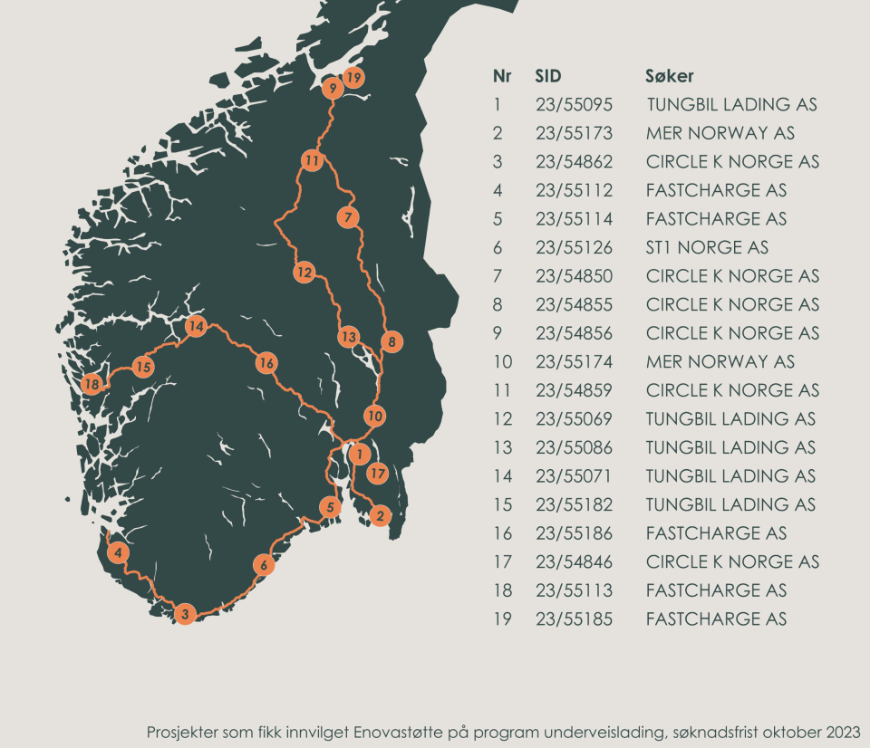 Om alle prosjektene skulle bli realisert, vil det dermed finnes 503 Enova-støttede ladepunkter for lastebiler i bedriftsregi og da 108 offentlig tilgjengelige ladere langs hovedfartsårene i Sør-Norge.