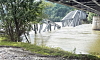 Broelementene er løftet på land - håper å kunne gjenbruke dem Store naturkrefter har ødelagt broen, og store krefter fikk også broelementene opp av elva.