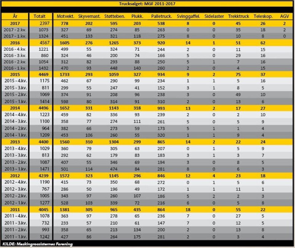 Det høyeste antall registrerte solgte trucker i løpet av ett år stammer fra 2007, da MGFs tall viste 5451 solgte maskiner. I 2016 var tallet 4567 solgte trucker, som var det høyeste siden 2008. Foreløpig ligger 2017 litt bak skjemaet til å tangere fjoråret, men ligger an til å føye seg inn i den stabile salgsrekken de siste fire årene, da salget bare har variert mellom 4400 og 4567 maskiner.