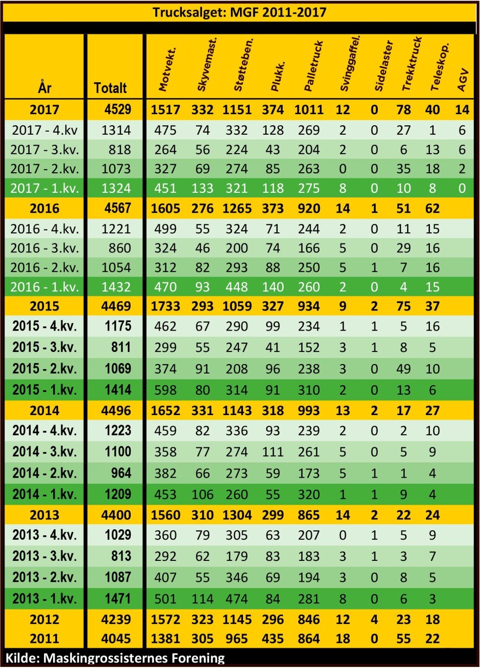 I 2017 ble det solgt 4529 trucker av MGFs medlemsbedrifter, en nedgang på bare 38 trucker fra året før.